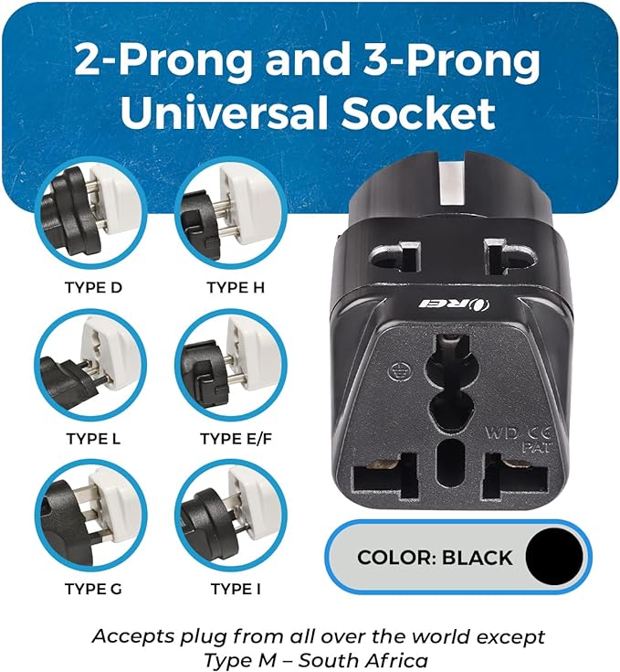 - 2 IN 1 : Accepts 2 Plugs in One, 1 Universal Socket which except plugs from all countries (except the Type M - big S. Africa 8.7mm Plug) and 1 Ungrounded Plug - 2 Pin USA or Round European Plug on Top
